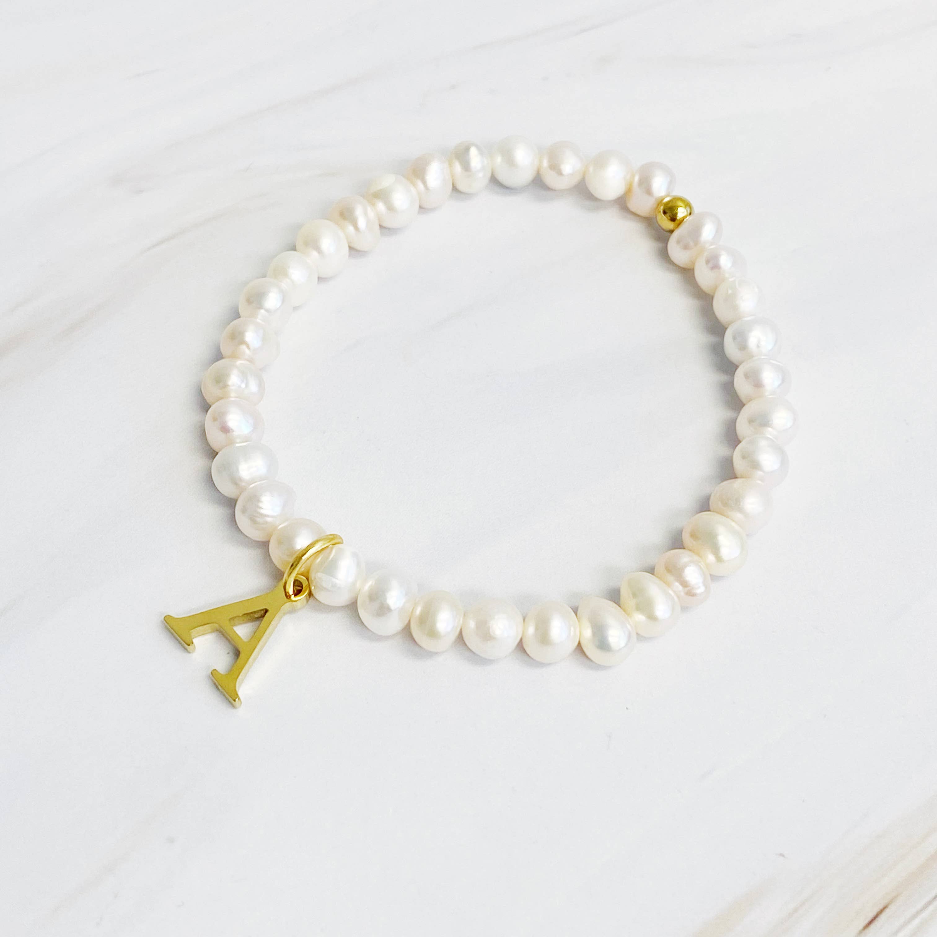 Adorn your wrist with a stylish Freshwater Pearl Initial Charm Bracelet. Featuring freshwater pearls and a clean font initial charm, this bracelet provides both timeless elegance and personalization.