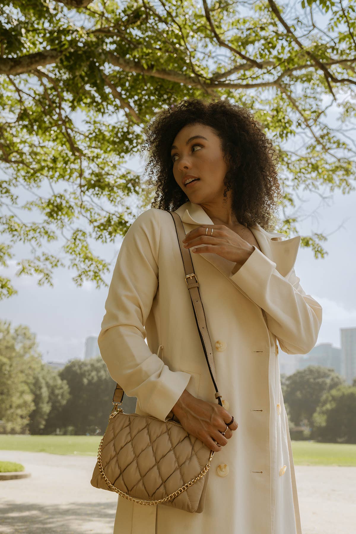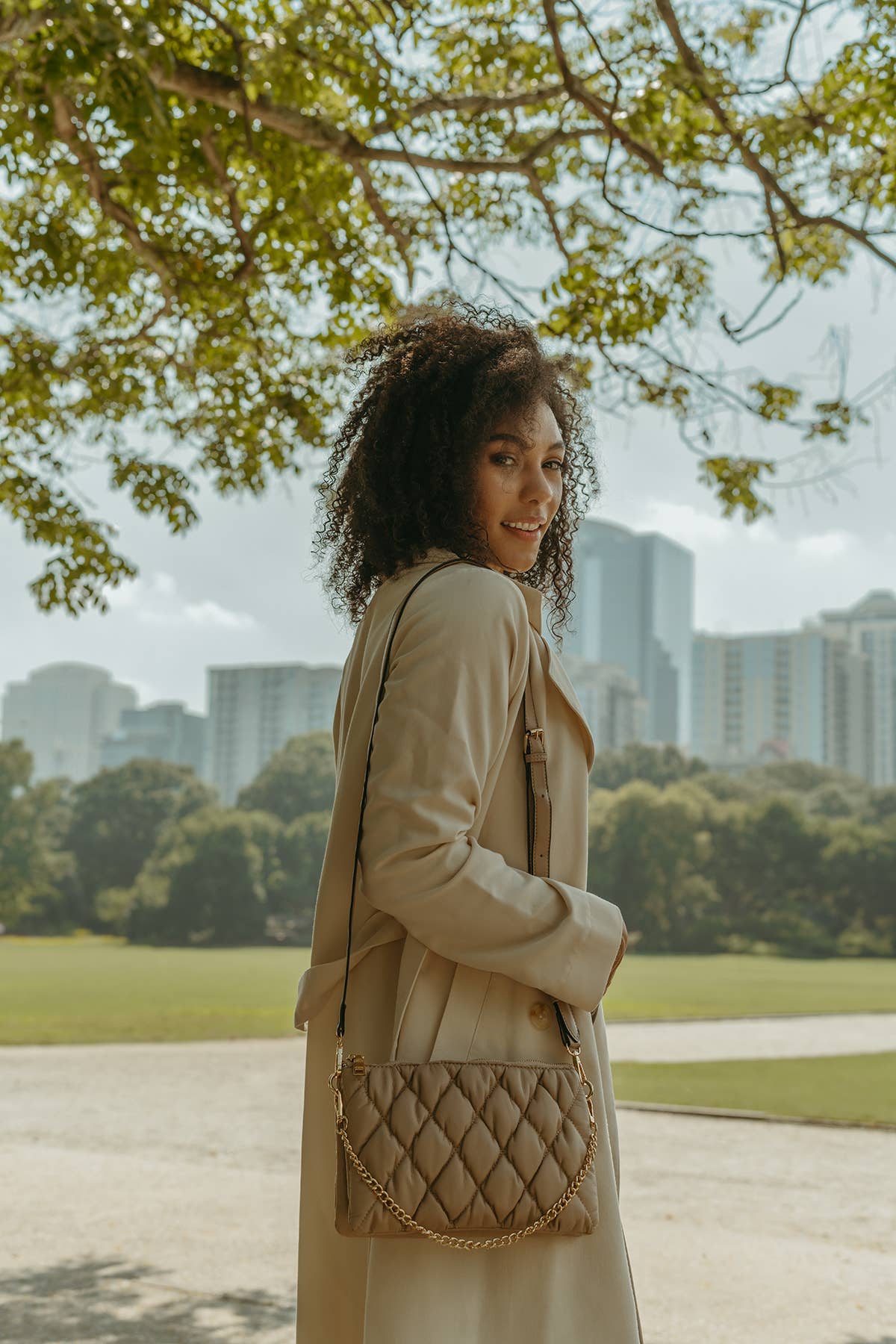 Meet the Izzy Puffer Quilted Crossbody with Chain, a chic blend of fashion and function. Designed in a modern quilted puffer style, this bag adds the perfect trendy touch to your accessory lineup. With three spacious compartments and inside card slots, it keeps your essentials neatly organized. The adjustable/detachable crossbody strap and removable chain strap give you versatile styling options—wear it crossbody for hands-free convenience or carry it by the chain for an elevated look. Sleek, lightweight, and effortlessly stylish, Izzy is your new go-to for day or night.