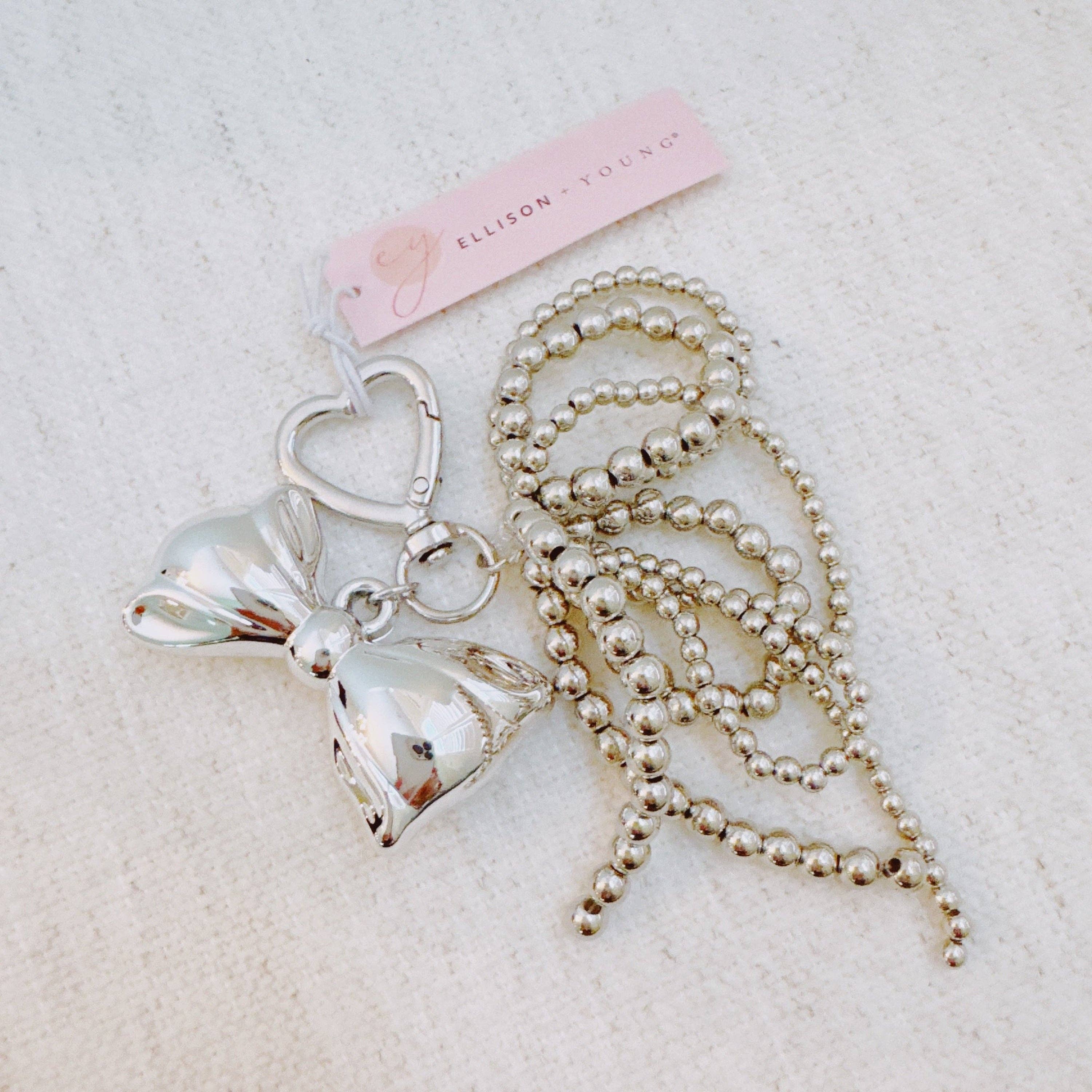 Add a touch of elegance with the Silver Cascade Bow Charm Bag Charm. Featuring a metallic silver finish and flowing bow design, this charm brings a graceful accent to any handbag.