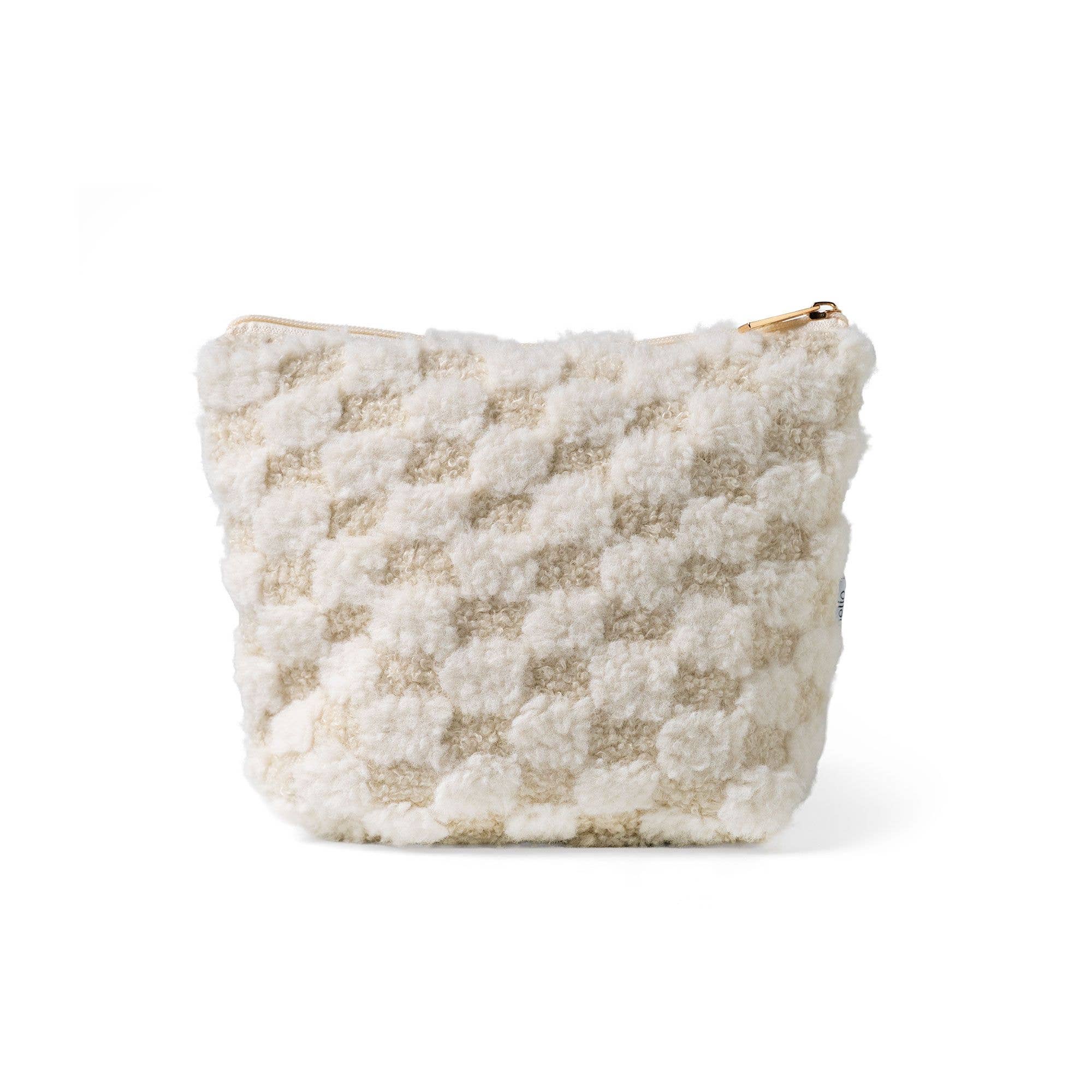 Designed in three fluffy checkerboard patterns, this zippered bag is a cozy catch-all for makeup, tech, travel and overnight essentials.
