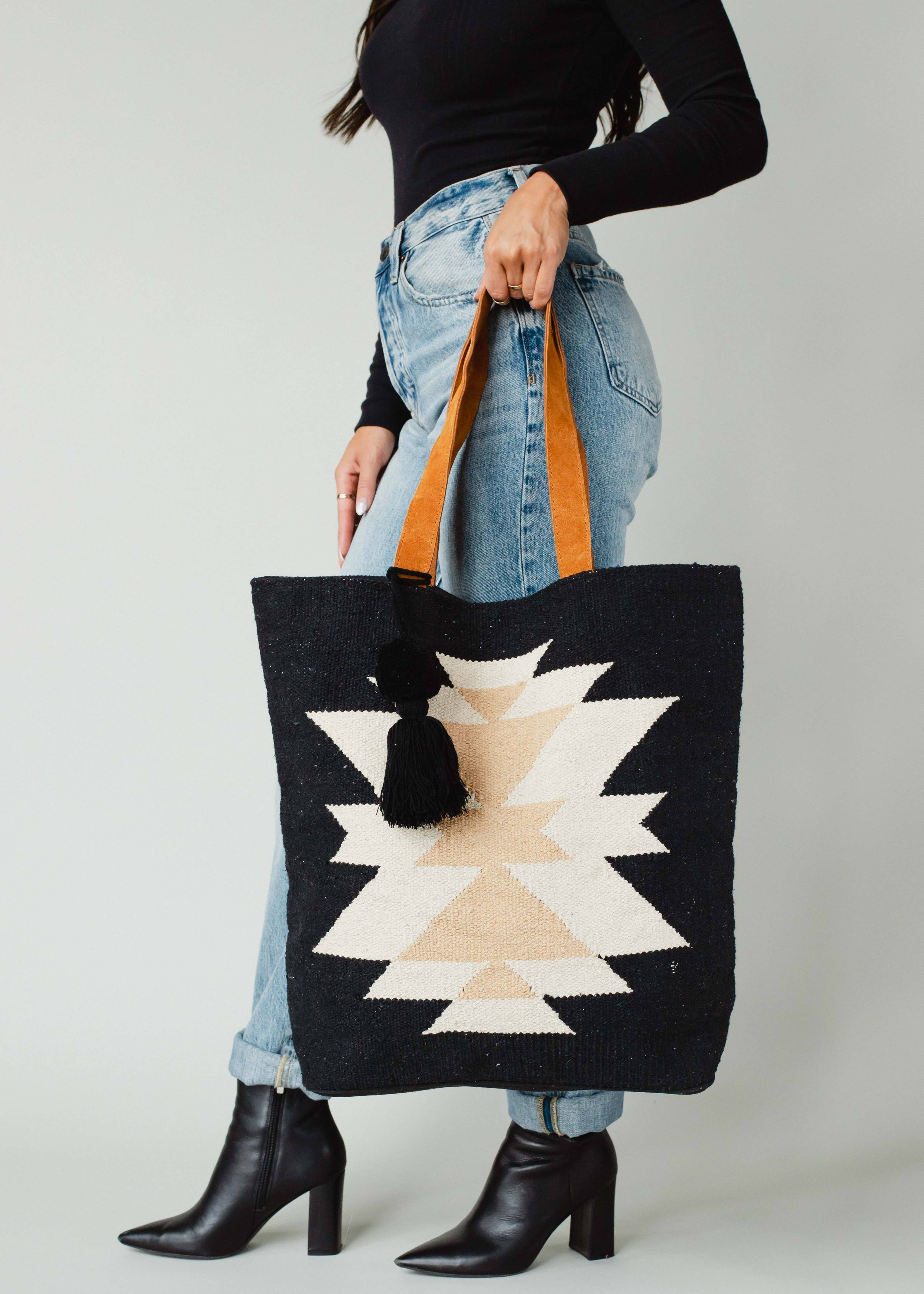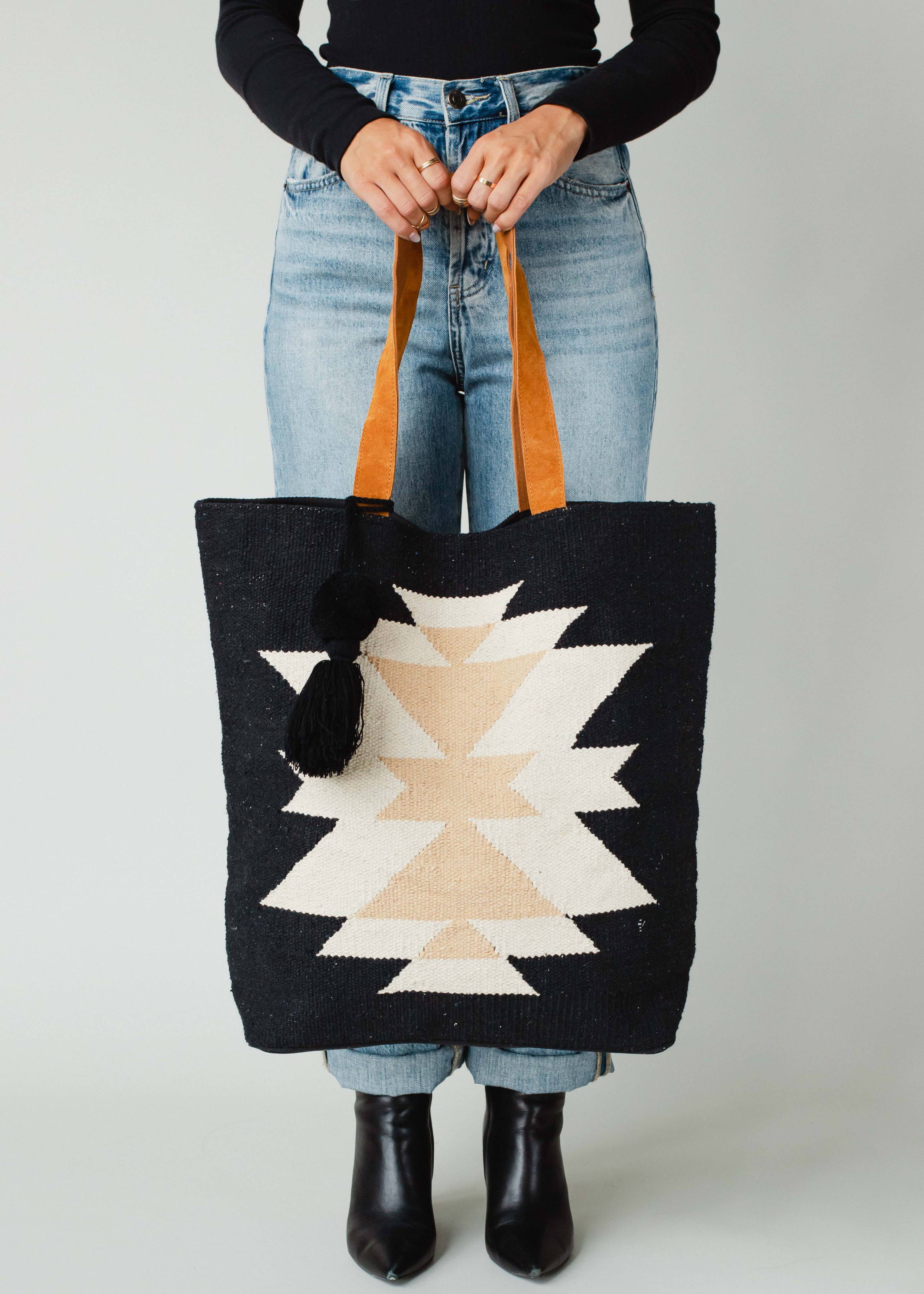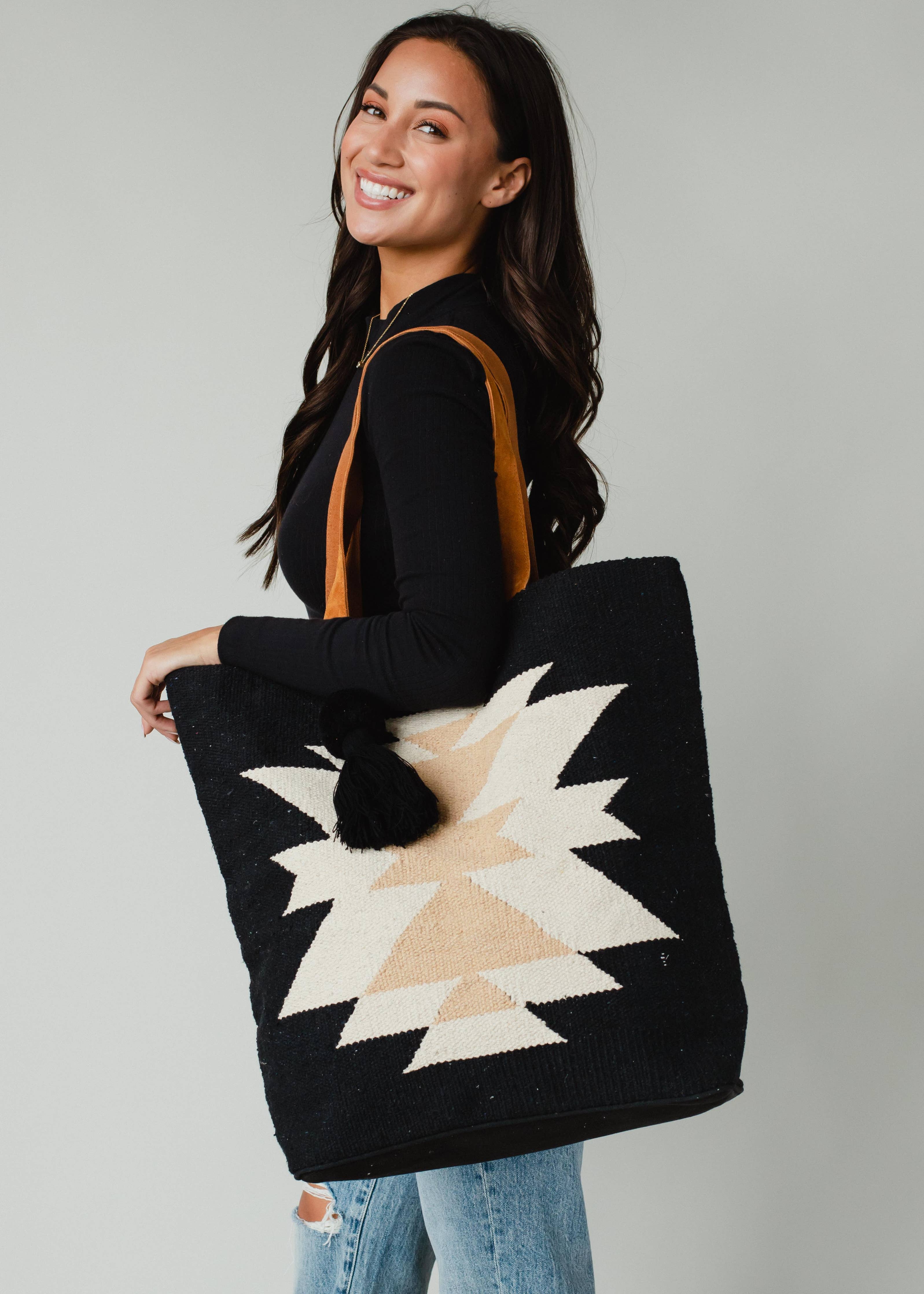 Black, cream & tan Aztec tote Camel pom tassel detail 17" x 6.5" x 14.5" 100% Cotton Min. Qty. 2