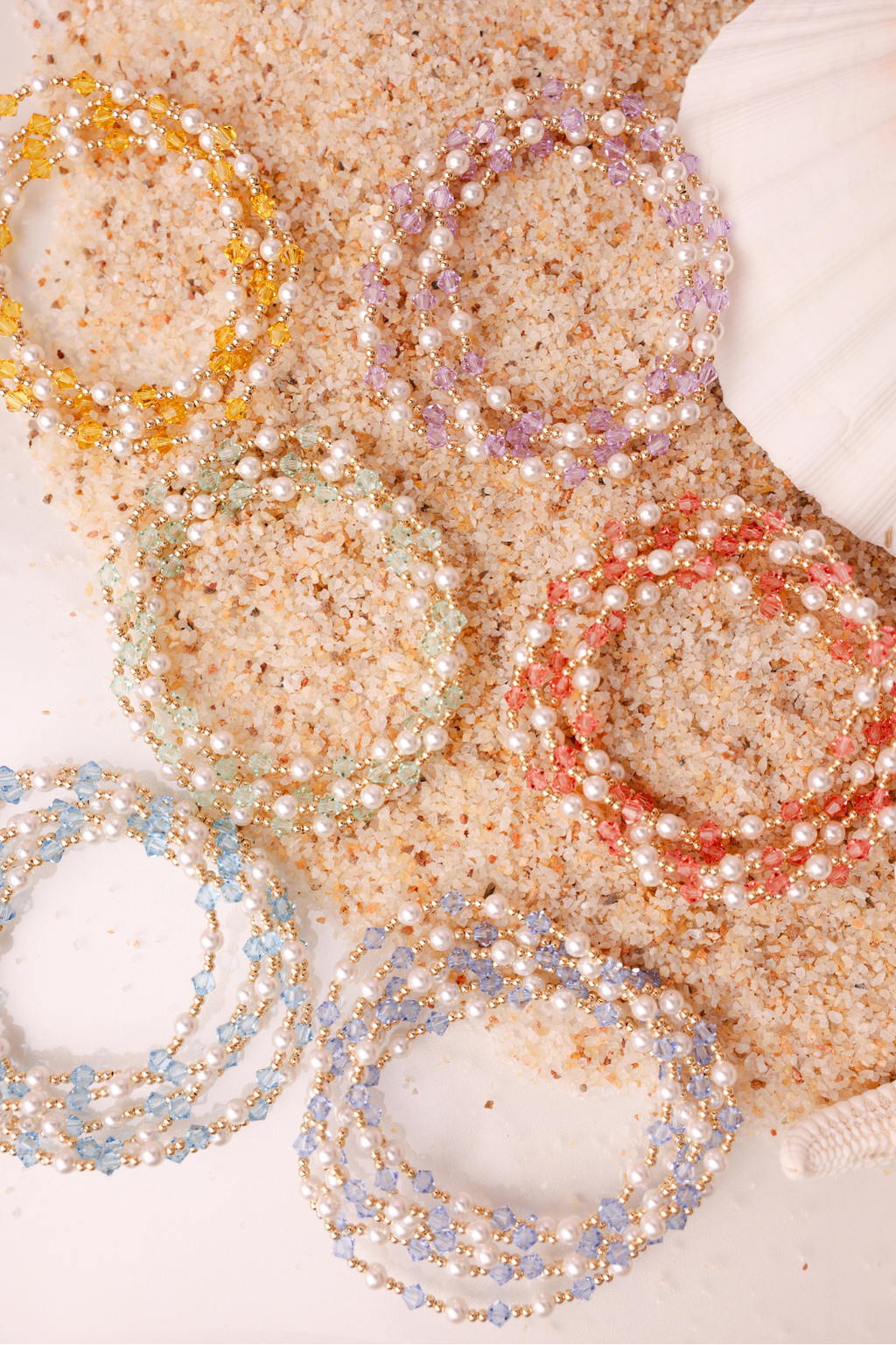 The June Swarovski Bracelet is a mix of 2MM & 4MM Synthetic pearl beads + swarovski beads.